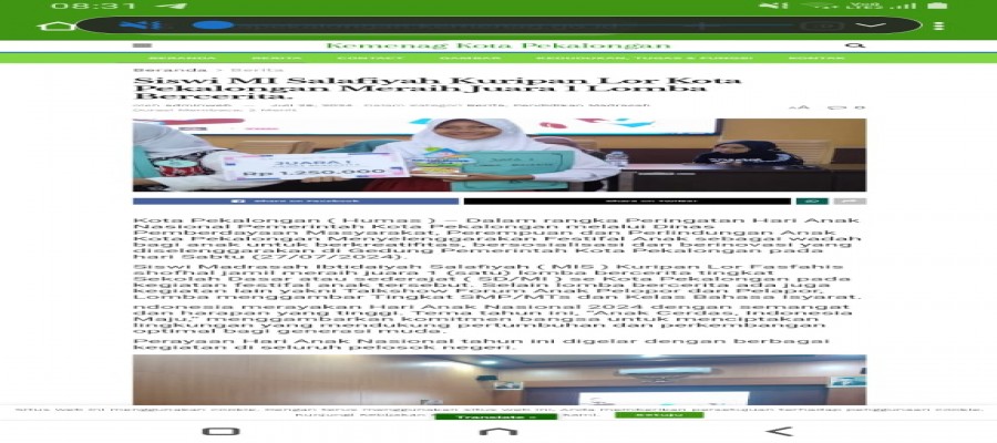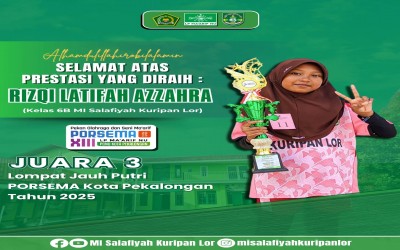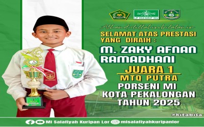 Alhamdulillah.. Atas berkah rahmat Allah.. Masih diberi rejeki. Kesempatan. Dan kepercayaan Menorehkan prestasi untuk membawa Tropi/medali 3 emas dan 2 perunggu di cabang seni PORSENI MI TINGKAT KOTA PEKALONGAN.. Selamat Kepada : 1. Ananda M Zaky Afnan